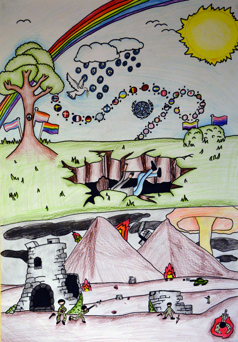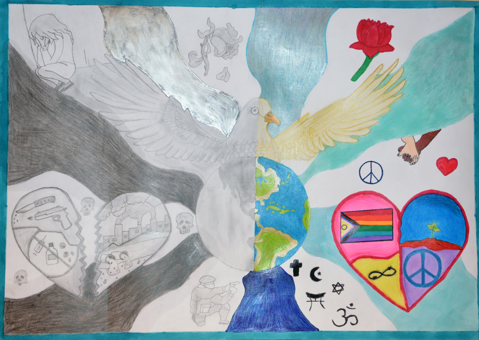 Lions fredsplakatkonkurranse har et nytt tema hvert år, og det handler alltid om fred. For høsten 2024 skulle de unge kunstnere visualisere "Fred uten grenser". I den norske finalen deltok vinnere fra alle fem Lions-distrikter og det var altså tegningen til Iben Olava som juryen mente skilte seg ut.