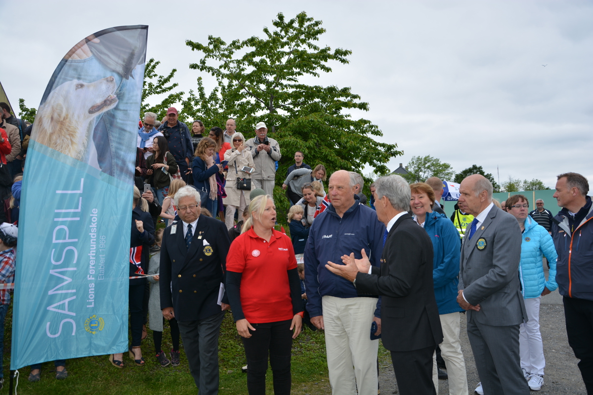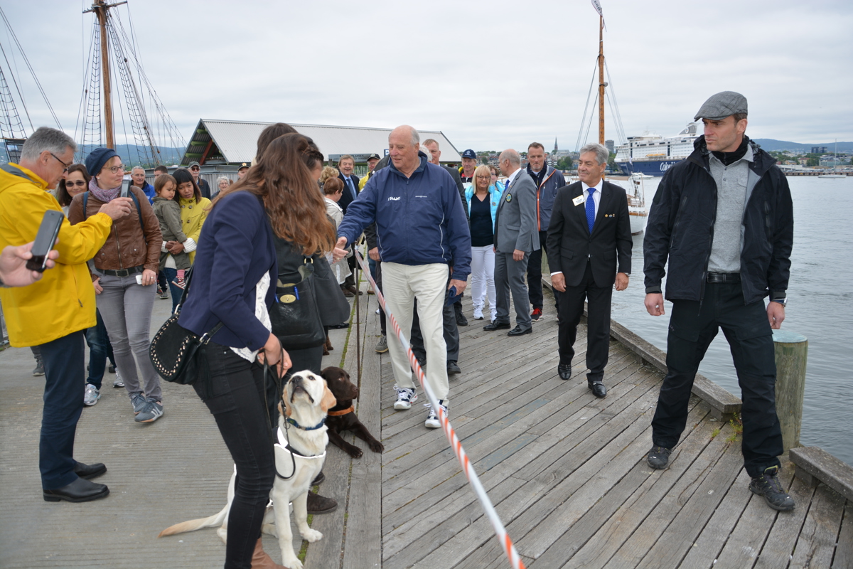 Kong Harald hilser på synshemmede som har fått førerhund fra Lions Førerhundskole under 100 års jubileet i 2027.