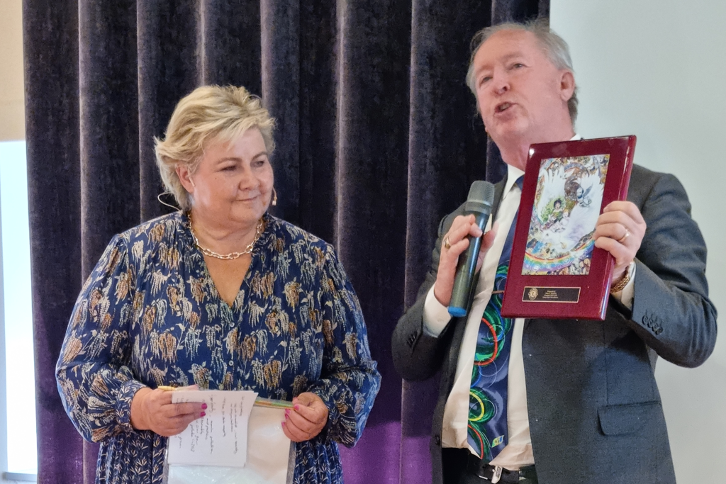 Erna fikk med seg en solid applaus, Lions Norges vennskapsbanner og en plakett med en vinnertegning i Lions Internasjonale Fredsplakatkonkurranse som takk for foredraget.