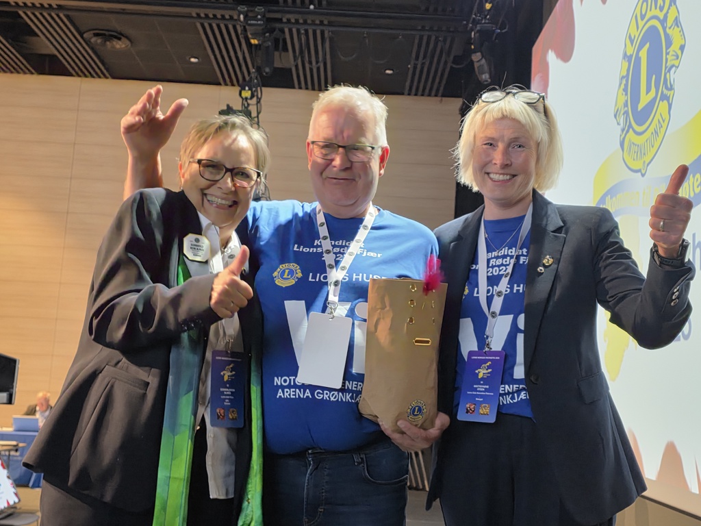 På bildet: Presidentene i Lionsklubbene i Notodden, Tor Sveinung Simones og Britt Synøve Steen, ble veldig glade for at Lions Norges Riksmøte 2025 valgte deres prosjekt som formål for innsamlingsaksjonen Lions Røde Fjær 2027. Guvernørrådsleder Gunnhild Rein Almås (tv) gratulerte.