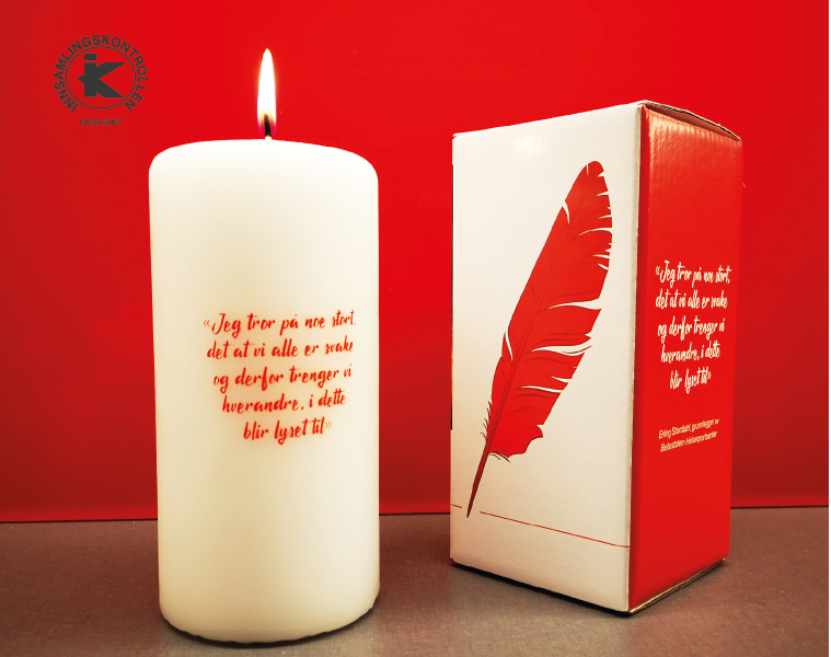 Kubbelys med trykk - sitat av Erling Stordahl og den røde fjæra – leveres i en flott dekorert gaveeske. Lyset er i format 7 x 15 cm. Fungerer ypperlig som for eksempel julegave, vertinnegave, til foredragsholdere, på gevinstbordet eller som en overraskelse til noen du er glad i!