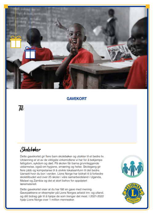 Dette gavekortet viser at du har fått en gave med mening. Gavepakkene er eksempler på Lions Norges arbeid i inn- og utland, og ditt bidrag går til å hjelpe de som trenger det mest. I 2021-2022 hjalp Lions Norge over 1 million mennesker.
