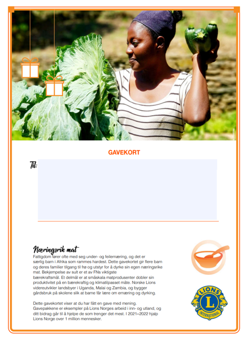Dette gavekortet viser at du har fått en gave med mening. Gavepakkene er eksempler på Lions Norges arbeid i inn- og utland, og ditt bidrag går til å hjelpe de som trenger det mest. I 2021-2022 hjalp Lions Norge over 1 million mennesker.