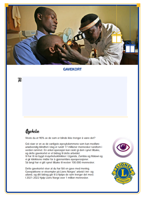 Dette gavekortet viser at du har fått en gave med mening. Gavepakkene er eksempler på Lions Norges arbeid i inn- og utland, og ditt bidrag går til å hjelpe de som trenger det mest. I 2021-2022 hjalp Lions Norge over 1 million mennesker.